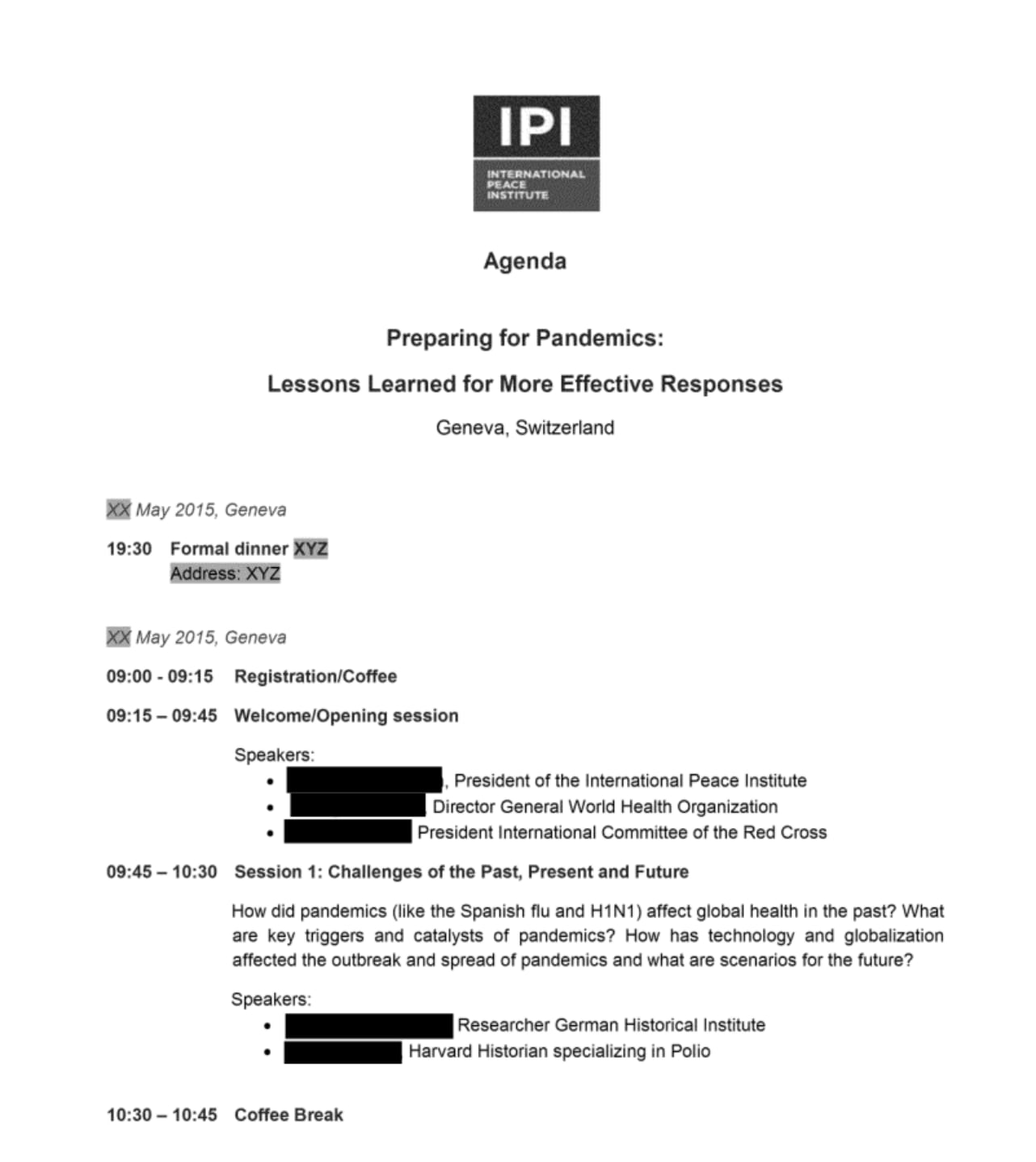 The proposal did not remain theoretical. In May 2015, the International Peace Institute convened a closed-door, high-level meeting in Geneva titled “Preparing for Pandemics: Lessons Learned for More Effective Responses.” The agenda reveals a convergence of institutional power rarely assembled outside moments of declared crisis: the Director-General of the World Health Organization, the President of the World Bank, the President of the International Committee of the Red Cross, the International President of Médecins Sans Frontières, and senior UN and global health officials.