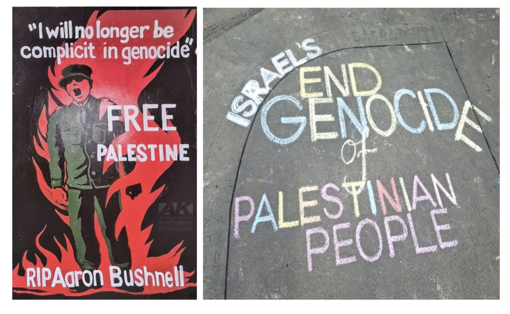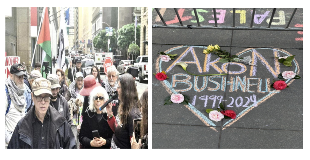 In front of the Israeli Consulate in downtown San Francisco, a memorial to Aaron Bushnell took place on Wednesday February 25. This date marks the second anniversary of what Aaron called his “extreme protest” against Israel’s genocide in Gaza.