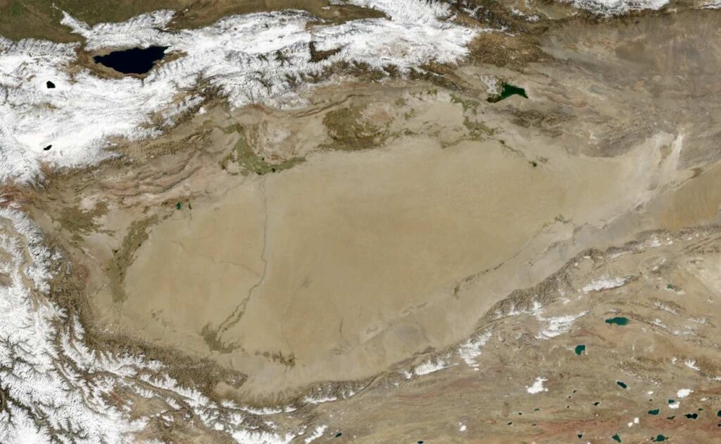 The massive Himalayas rise to the south and east, the Pamirs to the southwest, and a pair of mountains known as the Tian Shan and the Altai to the west, leaving landscape completely isolated from moisture.