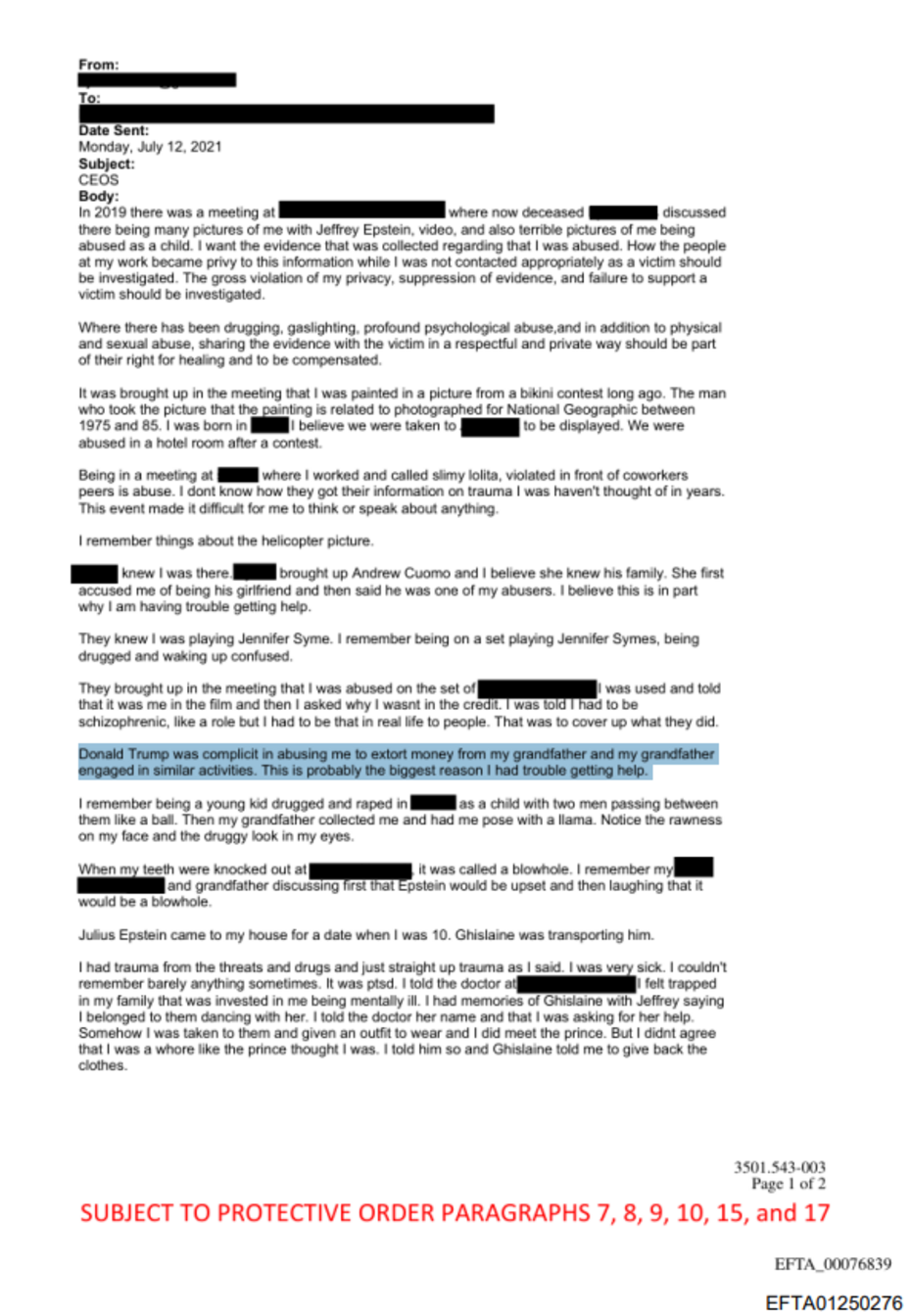 In a different file, an email dated "Monday, July 12, 2021" says this about Trump: "Donald Trump was complicit in abusing me to extort money from my grandfather and my grandfather engaged in similar activities. This is probably the biggest reason I had trouble getting help."