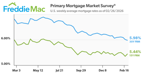 The 30-year FRM averaged 5.98% on February 26, 2026, down from 6.01% last week and 6.76% a year earlier. The last time the rate was below 6.00% was in September of 2022.