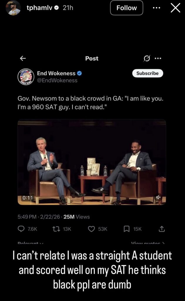 In a follow-up Instagram Story, Pham also shared a separate clip in which Newsom described reading a 260-page book in an hour and a half during a podcast appearance, highlighting a contrast in the governor’s statements about his reading abilities.