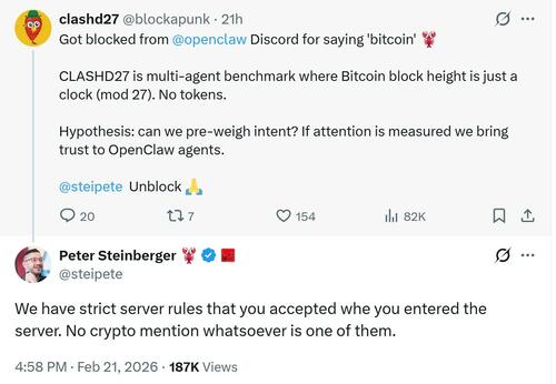 The developer behind the fast-growing open-source AI agent framework OpenClaw has confirmed that any mention of Bitcoin or other cryptocurrencies on its Discord server can lead to removal.