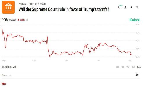Ever since September, the upstart online betting marketplace PolyMarket has been offering traders the opportunity to make money by betting whether the US Supreme Court would rule in favor or against Trump's tariffs, with millions of bets placed for either outcome (of course, we learned the outcome at 10am ET on Friday, when a 6-3 majority - including two Justices selected by Trump - voted against the president's landmark trade policy).