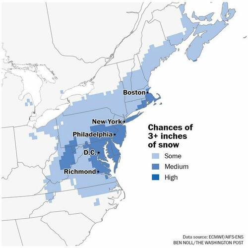 "As the forecast comes into focus, the latest probabilities show a medium chance for 3+ inches in a stretch from D.C. to Boston," Noll said.
