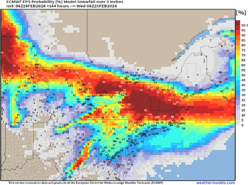 Ensemble Probability of 3 inches of snow: about a coin flip from Washington, D.C., to Philly and New York City