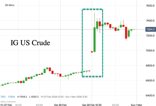 A synthetic weekend market via IG has crude oil prices up as much as 8%.