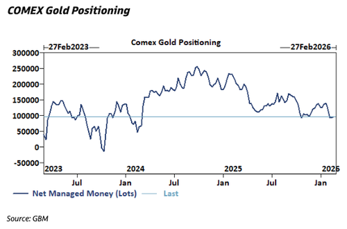 Additionally, we have seen a re-engagement in Gold upside as prices have consolidated above $5000/oz and 5 day realised vols have compressed to 27v vs a 100v high. Gold upside flow has migrated from VKO’s/Continuous KO’s to a mix of vanillas/EKO’s/Digis. While ETF holdings have continued to build, the market feels under positioned from the fast-money community - net managed money on Comex is sitting only in the 17th percentile vs the last 3 years and SHFE positioning is on multi-year lows.