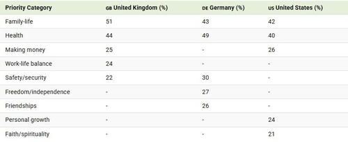 In the UK, 51% of respondents selected family as a top priority, the highest share among the three nations. Germany follows at 43%, while 42% of Americans say family matters most.