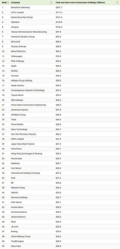 The data table below shows the top 50 companies worldwide with the largest cash and short-term securities holdings: