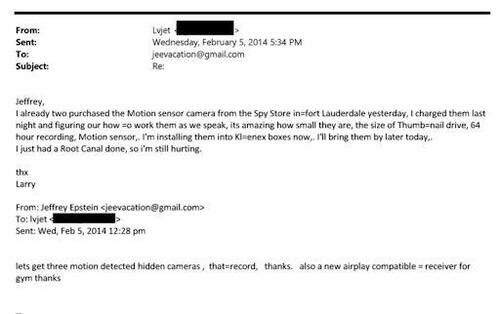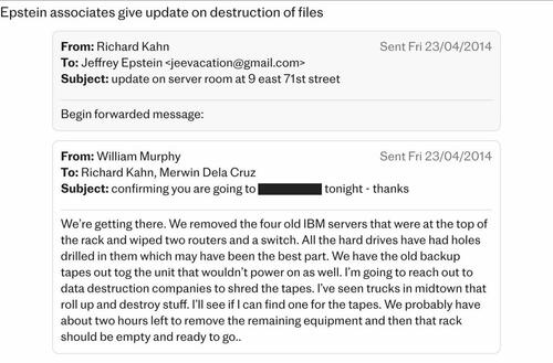 In a 2014 email, associates discussed destroying computer equipment housed in a server room at his Manhattan mansion. That same year, according to previously reported emails, Epstein allegedly directed staff to install hidden cameras inside Kleenex boxes - with one message noting, “The Russians may come in handy.”