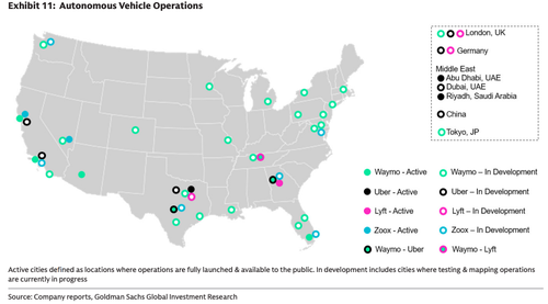 Last month, Goldman analyst Eric Sheridan provided clients with an update on the North American autonomous-vehicle (AV) rideshare market, which is quickly gaining momentum. Read the report here.