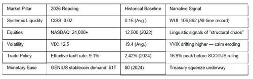The OBBBA also made the TCJA tax cuts permanent and reinstated 100% bonus depreciation for qualified production property — allowing corporations to manufacture “earnings beats” through accounting timing rather than genuine productivity growth. While “Liberation Day” tariffs initially averaging 16.9% (reduced to 9.1% after a February 2026 Supreme Court ruling) quietly decimated actual trade volumes with key partners, record corporate buybacks mechanically held earnings per share elevated. To a price-based stress index like the CISS, this looks like resilience. To an honest observer, it is rebar made of debt.