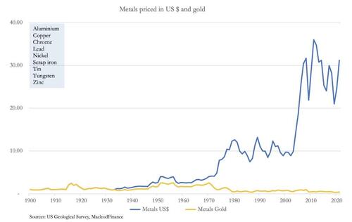 To illustrate this importance, the chart below shows average values for a range of industrial metals priced in dollars and gold, followed by a chart of oil similarly priced.