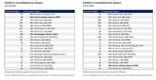 Cancellations were elevated on Sunday 2/22 and Monday 2/23, but largely driven by Winter Storm Hernando. On Sunday 2/22 and Monday 2/23, the industry saw an elevated level of cancellations, some of which were related to the ongoing unrest in Mexico, but with the majority driven by Winter Storm Hernando (see Exhibit 1 and Exhibit 2). For example, JetBlue had significantly higher cancellations than its peers on 2/22, with 44% of flights canceled vs. its competitors canceling less than 10% of flights, but JetBlue has <2% of capacity deployed to Mexico in 1Q 2026. Cancellations at select airports in Mexico were material, even from a global perspective, with Puerto Vallarta and Guadalajara among the top 20 airports with the highest cancellation rates across the world on Sunday 2/22 and Puerto Vallarata in the top 20 again on Monday 2/23 (see Exhibit 3 and Exhibit 4).