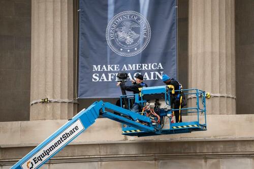 A banner showing President Donald Trump at the Department of Justice in Washington on Feb. 21, 2026. Madalina Kilroy/The Epoch Times